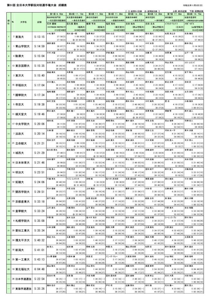 関 東早稲田大学15大会連続27回目第52回全日本大学駅伝5位の実績からシード早 稲 田 大5